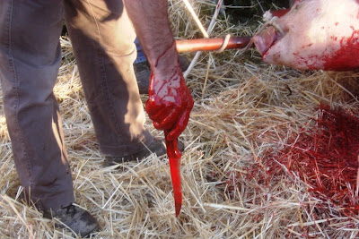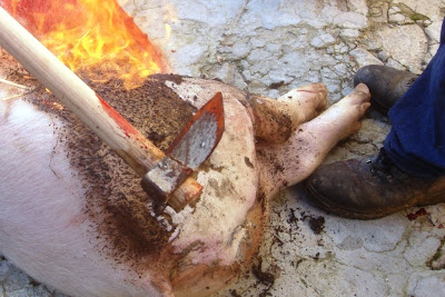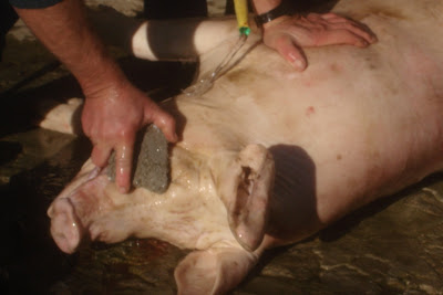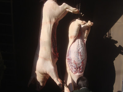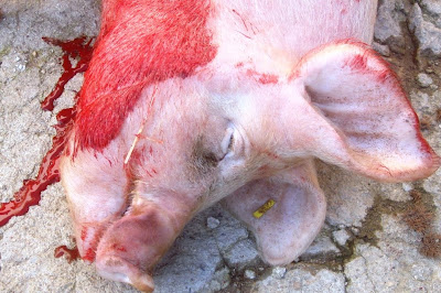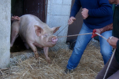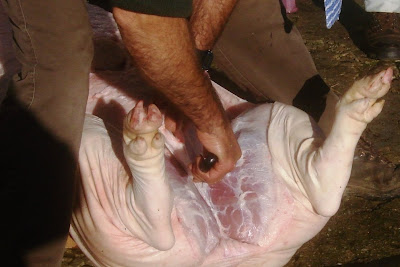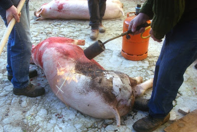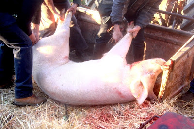 Quando cheguei para assistir à matança já o primeiro porco estava a cuincar, ferido no coração pela faca certeira do matador.