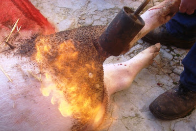 Chamuscando com maçaricoPara chamuscar o porco - queima dos pelos e da fina camada de pele sobre o couro - usa-se uma botija de gás e um maçarico em vez da tradicional palha de centeio. Como nas ceifas se enfarda logo a palha esta já nem existe e o uso do maçarico torna a tarefa de chamuscar mais fácil e rápida.