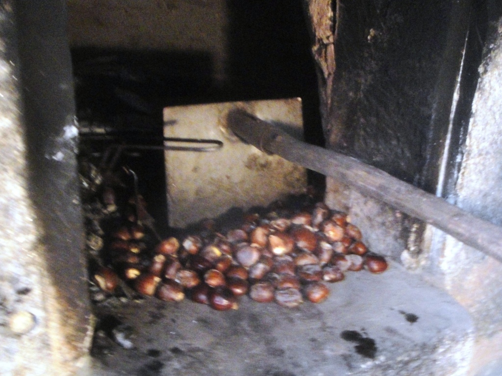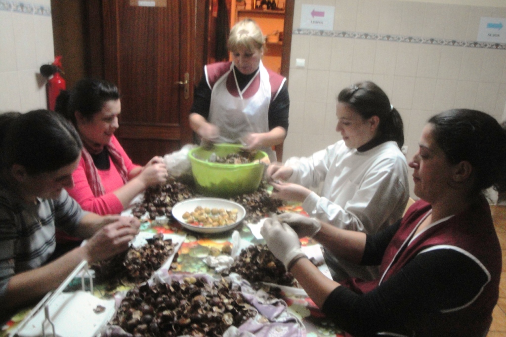 Descascando as castanhas assadas.