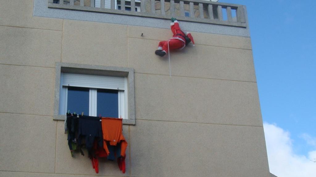 Pai Natal escalando até à chaminé, para por ela descer e entregar as prendas. Antes, era o Menino Jesus que fazia a entrega, no Dia de Reis, a 6 de Janeiro.