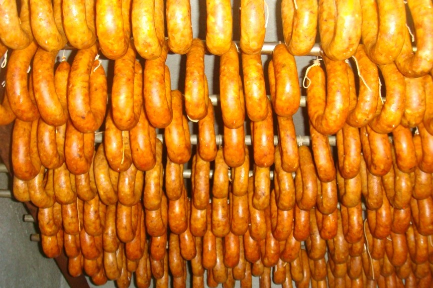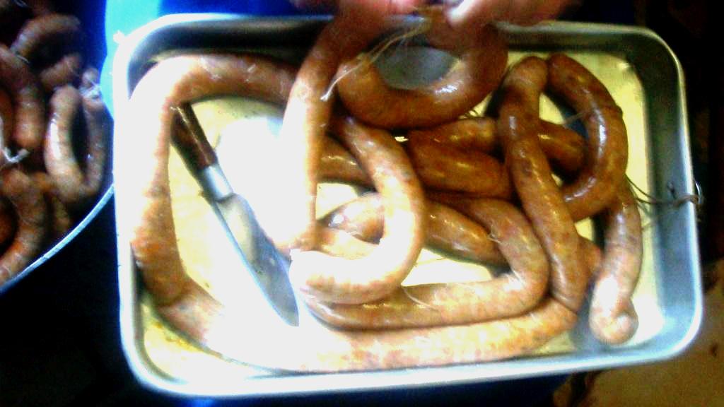 Tripas de porco, já cheias, prontas a serem atadas e cortadas.