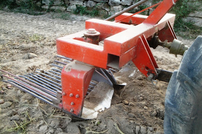 Já há largos anos que o arranque é mecanizado, feito por arrancadores atrelados aos tratores, embora eu só agora tenha visto. A máquina arrancadora tem duas cunhas largas, que se espetam na terra, por baixo da planta, passando batatas, ramagem e terra por uma esteira, em forma de grade, à medida que o trator avança.
