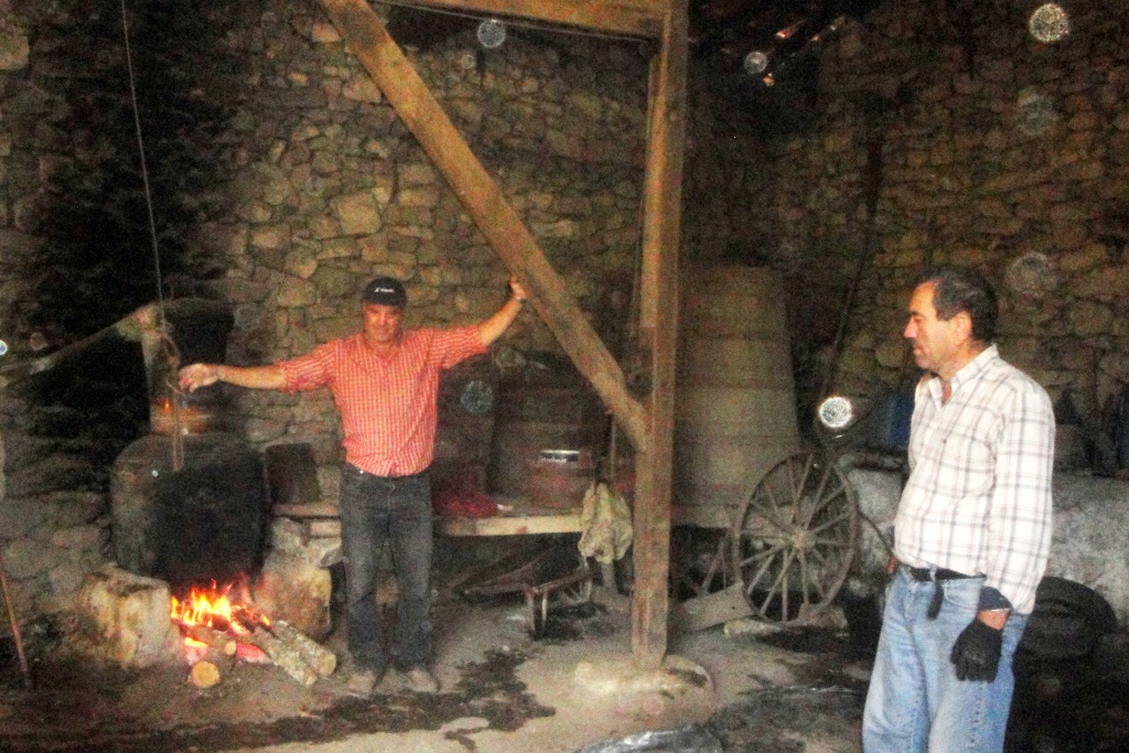A aguardente artesanal foi feita neste tradicional alambique de cobre, composto por uma caldeira e um capacete, unidos por uma pasta de cinza. Em Travancas, como não há alambiques, os produtores de vinho que pretendam fabricar bagaceira, levam a canga a uma destilaria de Chaves.