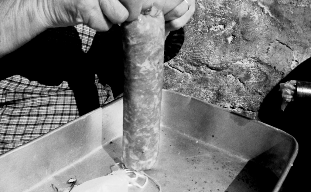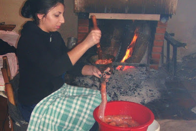 Fazendo chouriças. Maria, assim se chama a menina, tirou uns dias de férias para ajudar a família a fazer o fumeiro.