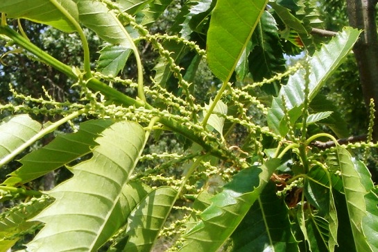 Cada árvore desenvolve flores masculinas e femininas, surgindo estas um mês mais tarde.