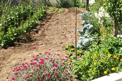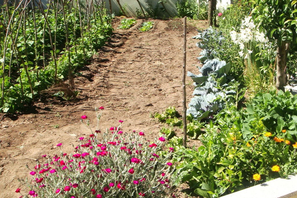 Nele não há só flores. Há também, bem regadas, caminheiras de alface, viçosos canteiros de cebolas e batatas, morangueiros e diversas árvores de fruto.