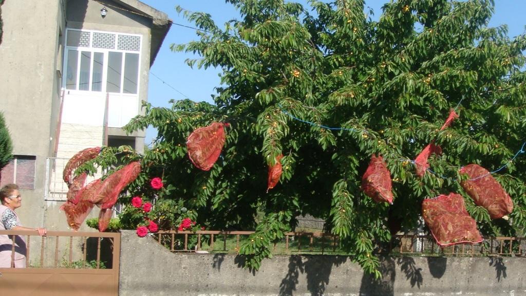 Entretanto, ao passar na estrada, vi uma cerejeira com sacos usados para ensacar batatas. Parei o carro e desci para perceber. A dona Teresa explicou-me então que esta era uma forma de salvaguardar as cerejas da ação predadora da passarada.