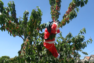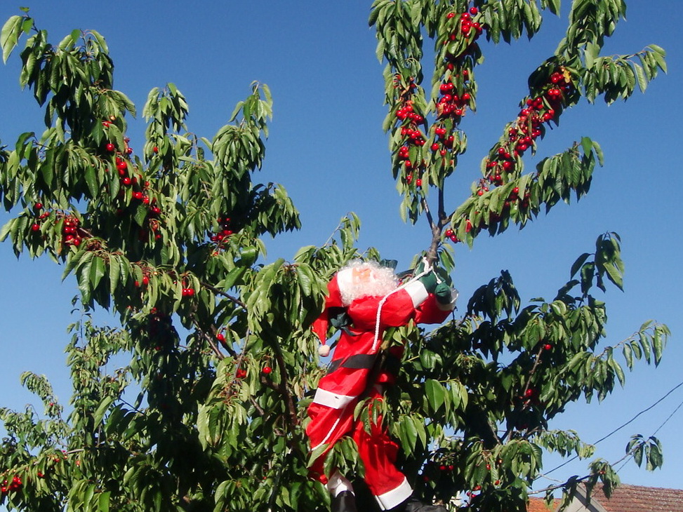 Com tais exemplos, porque não por o boneco do Pai Natal, guardado na loja, a fazer o papel de espantalho? Foi remédio santo! Diverti-me, a observar a reação dos pássaros. Chegavam lampeiros, em voo rasante, para debicar as cerejas mas, ao se aproximarem, batiam asas, levantavam voo e iam pousar na nogueira. A maior parte das cerejas ficou salva!