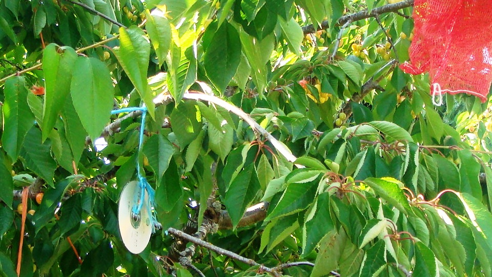 Além de se cobrirem as cerejas com sacos de batatas, também se penduram CDs nos galhos. O reflexo do disco "cega" os pássaros, mantendo-os afastados da árvore.