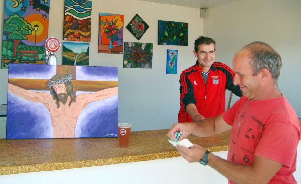 Desempregado desde janeiro, a iniciativa de expor os quadros durante a festa, corre-lhe bem; Até sábado à noite, tinham sido vendidos dois. "Tenho pena de vender um quadro", confessa, explicando a forte ligação emocional que o prende a cada pintura, ficando no entanto satisfeito, se percebe que o comprador tratará a sua obra com carinho.