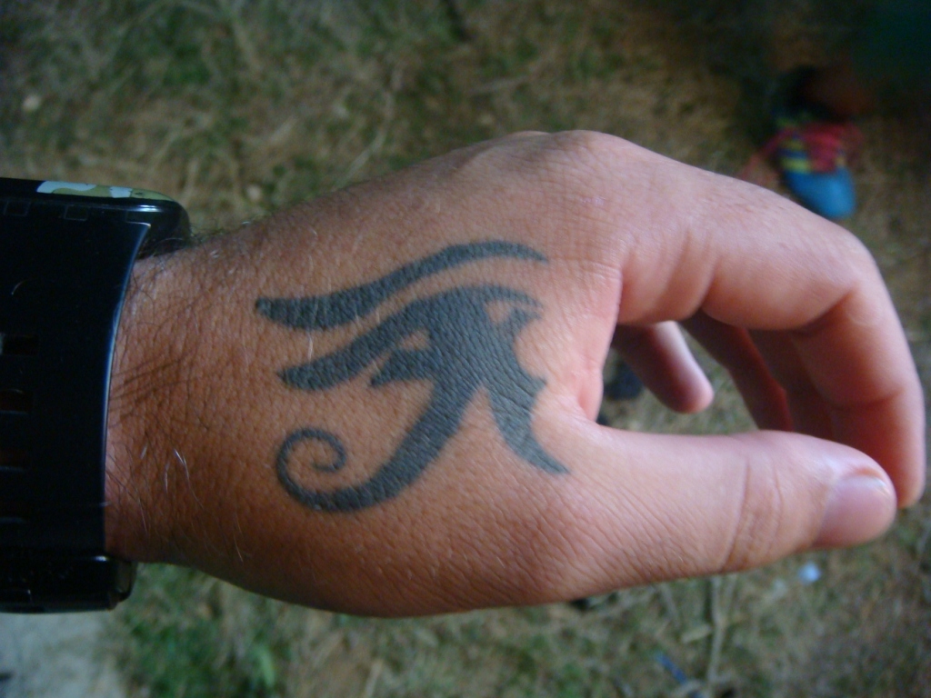 Olho de Horus, deus egípcio, amuleto protetor tatuado na mão do pintor. Para êle, Horus - Deus do Sol ou Rá - representa liberdade, paz, harmonia.