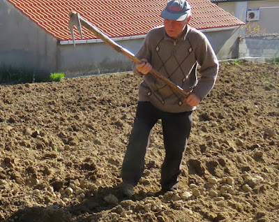 As batatas, depois, cobrem-se com enxada, como está a ser feito pelo Luís. Passadas duas semanas, arrancam-se as ervas daninhas com guinchas.