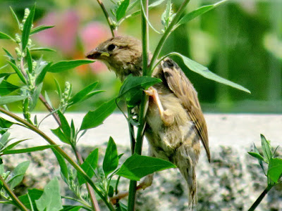 Imitando a mamã, o passarinho levanta voo mas não vai longe; cai no batatal, do outro lado da rua. Desesperado, sobe para o ramo mais alto de uma erva daninha.