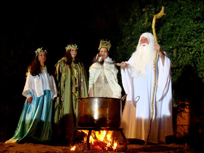 Mago a fazer queimada - poção mágica que aquece o corpo - observado por três deusas celtas. Os aldeões dão-lhes o nome de bruxas; meigas, em galego.