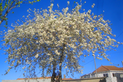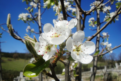 As primeiras a florir foram as ameixeiras. Seguiram-se as pereiras e agora é o tempo das cerdeiras florirem.  As últimas a florir são as macieiras e os marmeleiros.