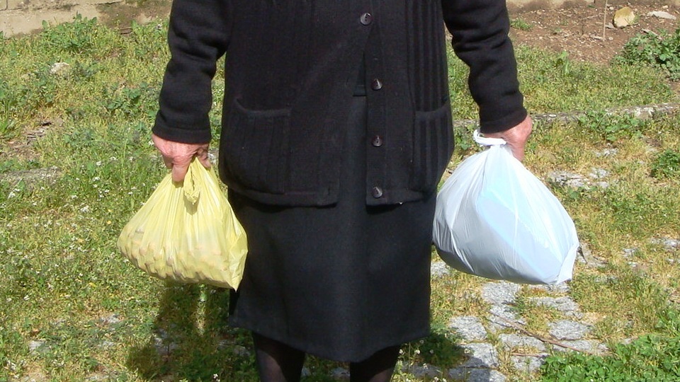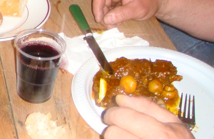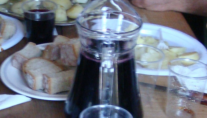 Pão, vinho tinto e batata da terra para acompanhar a caldeirada.