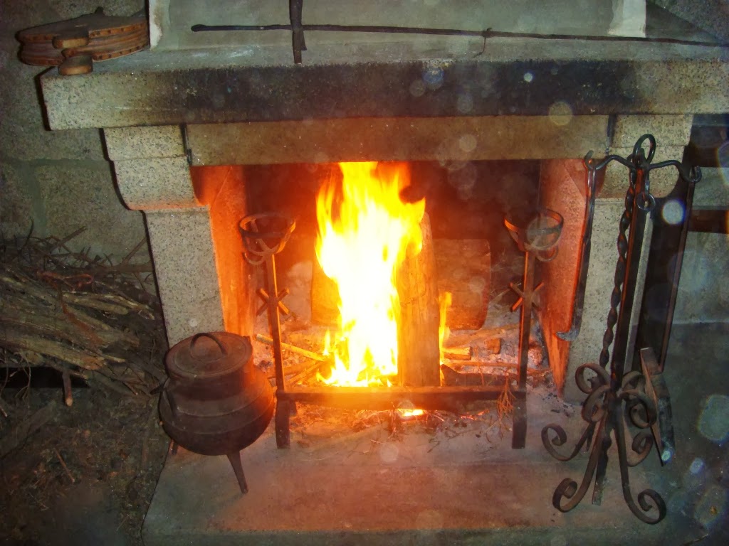 Com a lareira da cozinha,  eu tínha o pote da água quente, o fole, o trasfogueiro e as tenazes com que mexia nas brasas, enebriado pelo fogo purificador. Sobre elas punha a grelha para grelhar a alheira e o assador de castanhas, pendurado à cremalheira, decorada com a candeia.