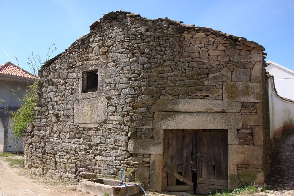 Casa ou armazém com porta carral, da cultura do granito, em cuja parede é visível o excesso de cimento nas juntas a cobrir a rusticidade da pedra.