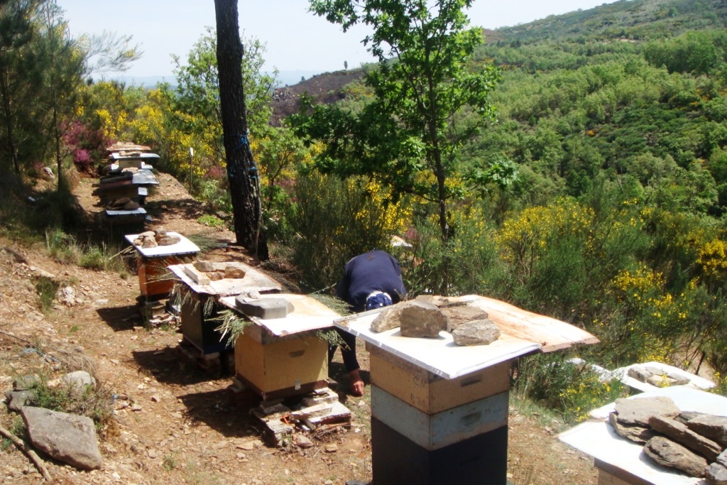 O apiário, constituído por dezenas de colmeias, espalhadas por socalcos, fica em frente à ribeira, numa encosta ensolarada, voltada para sul.
